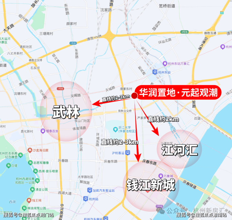 杭州华润置地·元起观潮择址城市精粹之上——上城区安琪儿板块,毗邻杭州第一中心武林和第二中心钱新,北近京杭运河,土地价值高,环境优美,交通便利,是杭州新城核心组成部分。项目所在大区域为城市核心区,周边路网发达,城市界面较好,场地周边已规划幼儿园及小学,配套齐全,地块北侧200M为京杭运河,为场地赋能。
