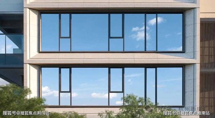 历久弥新的经典形制丨高层:底层以沉香米黄石材多重叠加,主体大面三玻两腔玻璃幕墙+仿石铝板斜切面搭配古铜色铝板内侧镶边打造大尺度油画框般经典华丽的立面,北侧搭配深灰色格栅强化立面对比效果;