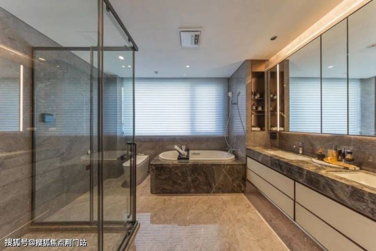 从餐客厅的大理石地面、岩板背景墙,到厨房的老板四件套(含三眼灶);从主卧的硬包背景墙、鱼骨拼地板,再到主卧卫生间的镜柜嵌美妆冰箱、石材底座浴缸,实用与质感直接拉满。