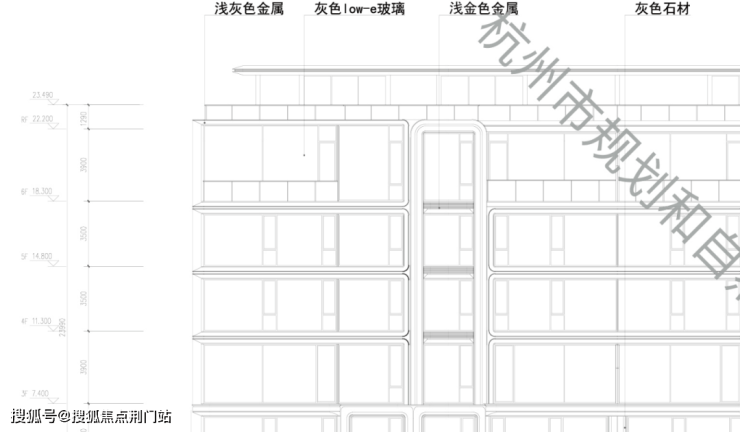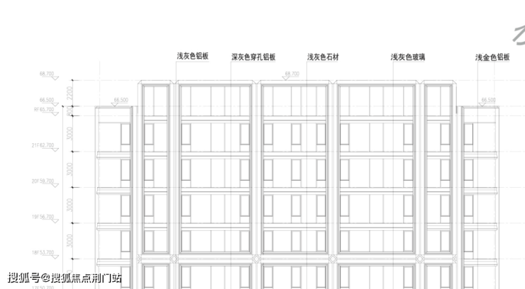 高层标准层高3米,立面由浅灰色铝板、石材、玻璃组合而成,时尚、大气。