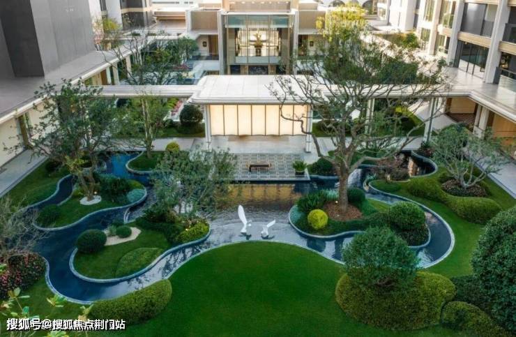 滨江经典的热带园林景观,种满了高大的热带树种;除了下沉式庭院中的水景外,园区中央还有一座异形景观水池。