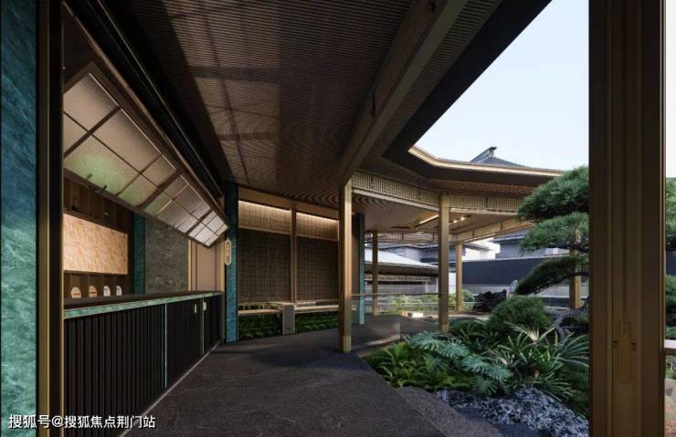 【春序里】的美,不限步于雅艺之美的追求,亦是对高贵、尊崇之美的执念。大门主体遵循了宋代皇家最高礼制,云石造景、青松夹道,约30米宋制门头、约55米威然门仪,将东方大国独有的巍然气势迎面而来。三重檐九重脊的设计,取意宋徽宗的得意之作《瑞鹤图》,展现建筑的威仪与内敛。重檐之下的泗水归堂,以传世玉璧圆环为源点,暗合东方天圆地方的文化观,承接自上而下的天降甘霖,象征聚风纳气,藏蓄八方财禄,阖家欢聚的美好寓意。