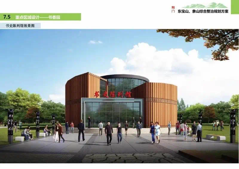 书香广场正在建设中,荆门园林设计院结合上山通道设计成一个书香主题广场,以郭店楚简和中华书史为核心,以竹简和读书台为设计元素,设计书香有路、健身长廊、书籍成列馆等展示竹简及书籍发展史。