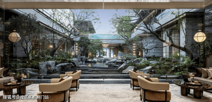 中心华盖之下,是汉白玉整石为主景的叠水,寓意着藏风聚气又纳财;左右两边的华盖下方,则做了诗意的堆坡造景,两棵铁冬青就像展品一样精致。