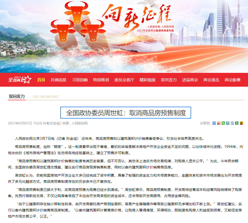 3月8日,多家媒体报道了这样一个消息:全国政协委员周世虹提交提案,建议实行商品房现房销售制度,同时以套内建筑面积计价销售商品房。