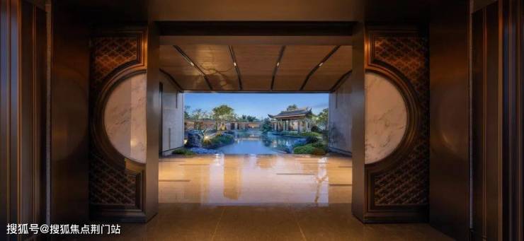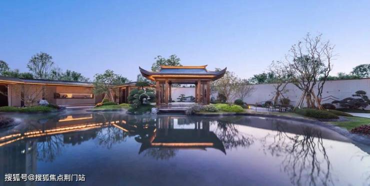 三面的大面铝板,搭配传统飞檐,再用金色云纹装点,新中式的建筑与园林,也相映成趣。