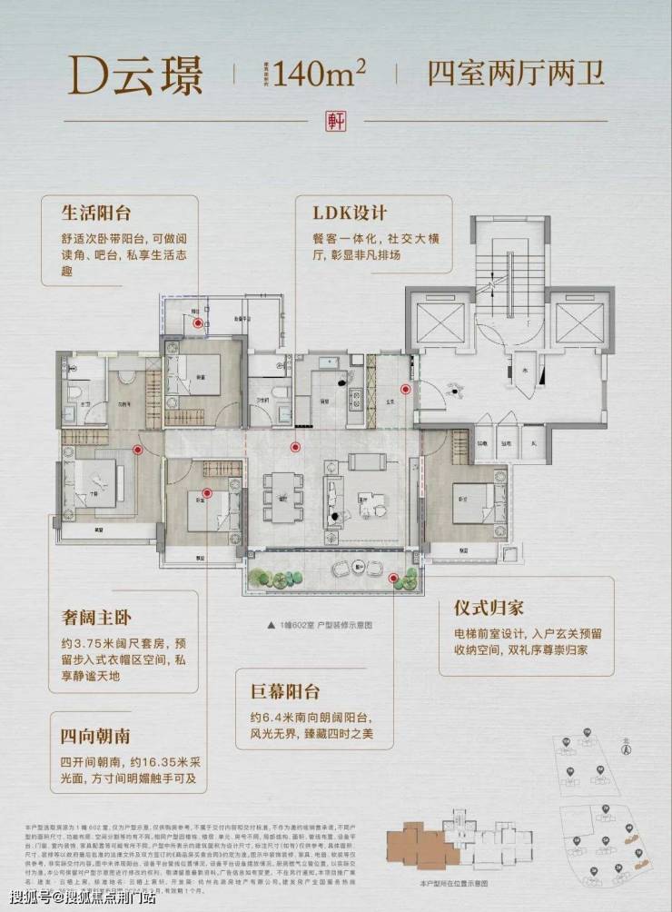 如果希望尺度再大一点,还有约140㎡奢阔四房,4.5开间朝南,整体南向面宽又被拉长到了约16.35米,相比约130㎡四房,又多出一个南向卧室。