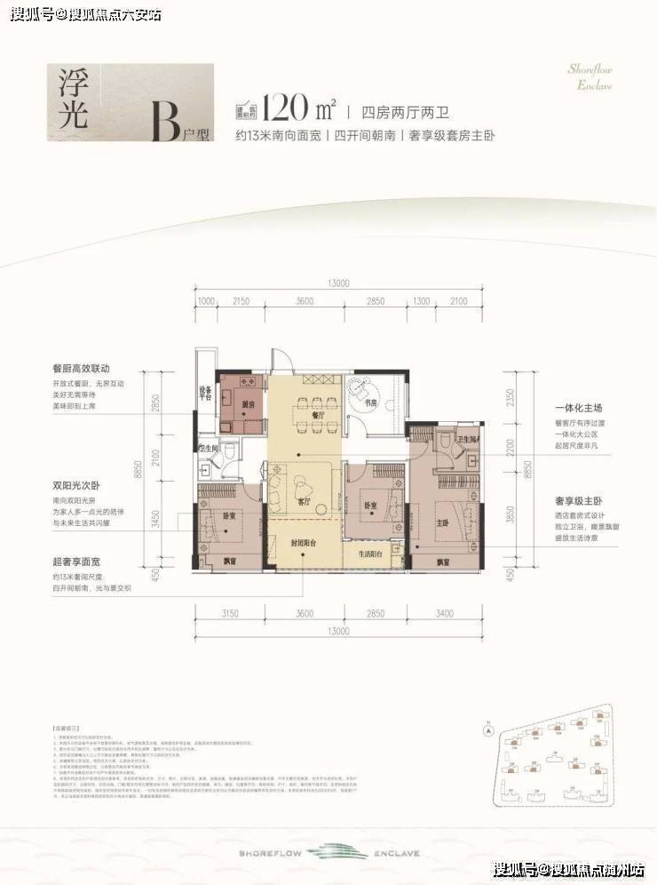 这款户型堪称四开间朝南的“流量王者”,南向面宽约13米,双联阳台+双飘窗设计,视野和采光优秀;套房主卧、双阳光次卧,颇有大平层的气势。