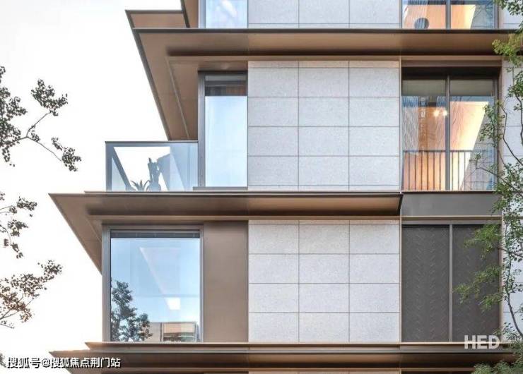 材料选择上,我们强调天然材质与现代工艺的结合。灰白沉稳色调的美国白金石材、深灰厚重的层间金属披檐、细腻精致的暮云金金属线条,这些材料共同营造出内敛而富有温度的外观。