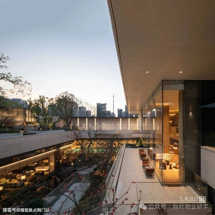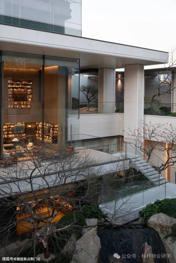 日光熹微,石材温润与金属光泽相得益彰;黄昏时分,金色线条与运河鎏金光影呼应,营造静谧尊贵氛围;夜色中,灯光透过材质缝隙溢出,让整个群落如同运河畔的图景,温润而有力量。