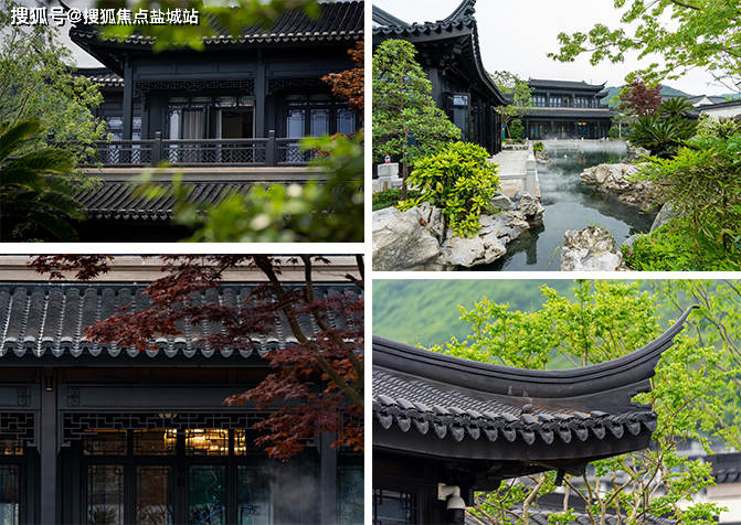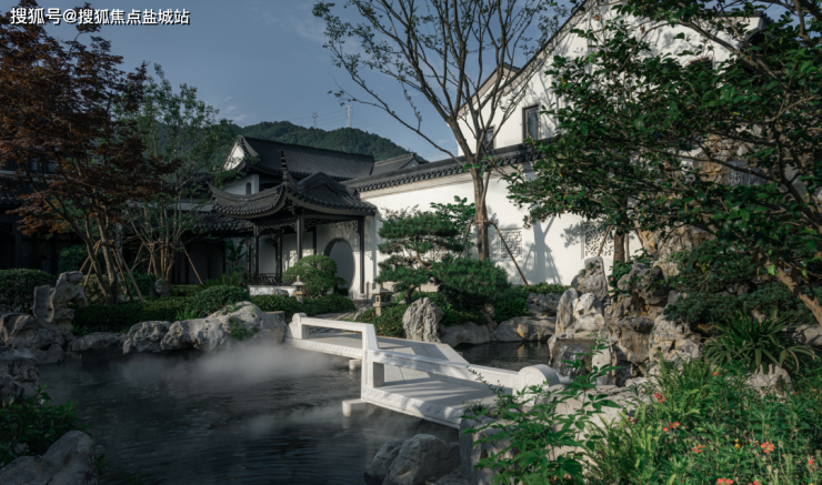 江南园林甲天下,苏州园林甲江南,比如像我们现在看到的园林布局,就是经典的苏州园林景观,讲究引水入园。造景围绕着这片水景展开,空间上比较有层次感。近景是流水、堆石,中景是连廊、假山,远景是中式合院的院墙、屋檐。