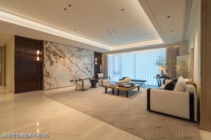 室内精装还有更炸裂的,比如客厅背景墙,采用极为珍稀的“维多利亚金”石材,是设计师飞到土耳其古老矿区挑选出来的。端详其纹理如行云流水,既有金石固有的厚重与永恒感,又蕴含着丝绸般的柔美与流动感。