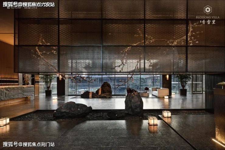 园林设计以中央山水景观轴为骨架,构建“一轴一带八景十巷”的多进式体验。入口处50米跨度大门以亚马逊黑奢石打造墙面,对景墙以亚马逊绿奢石镶嵌金石,刻绘项目Logo与六瓣梅花图腾,彰显沉静尊贵气质。