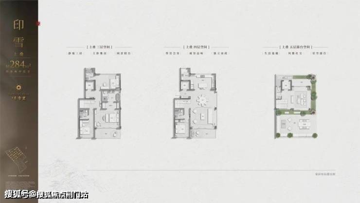 上叠建面约284㎡,可以通过北花园入户;卧室区设在3楼,与下叠卧室层相邻,动静分明,客餐厅在4楼,拥有更上一层楼的好视野;5楼则有南北双露台,是可以在露台上开夜宴的尺度了!