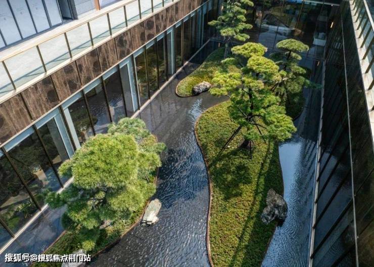 满眼青绿的宋风园林之间,就是排屋平直流畅的歇山顶与三重檐。