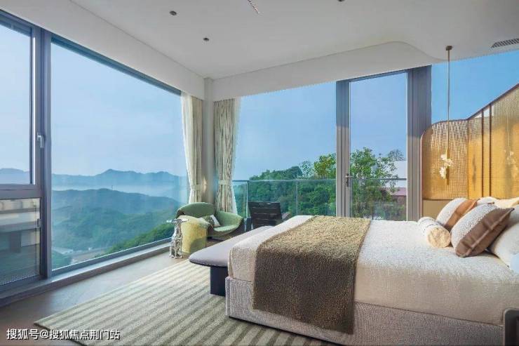 此外,大面全景玻璃立面,亦吸引了全城目光。大面玻璃的设计,搭配清雅的色调,让建筑美得像一座美术馆。全景落地窗的环幕宽屏视野,更带来绝佳的赏景体验。无论你是躺在卧室还是坐在客厅舒适的沙发上,都能将无边的苍翠群山尽收眼底。