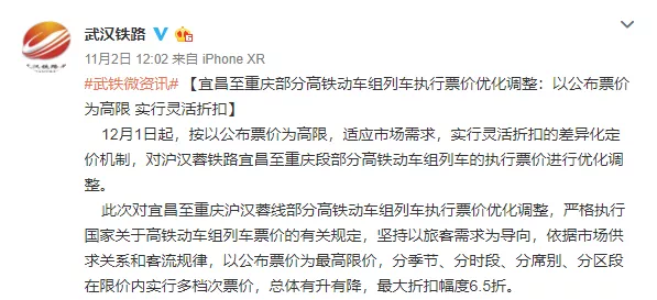 记者从中国铁路武汉局集团有限公司获悉,12月1日起,宜昌至重庆段部分高铁动车组列车的票价将进行优化调整,较高可享受6.5折优惠。