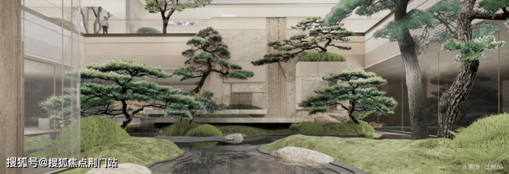 景观设计由北京顺景园林操刀,以“溪山行旅”为叙事主线,打造“归林-观山-临水-栖谷”四重景观序列,中央水景池底镶嵌《溪山行旅图》局部浮雕,实现文化符号的沉浸式植入。