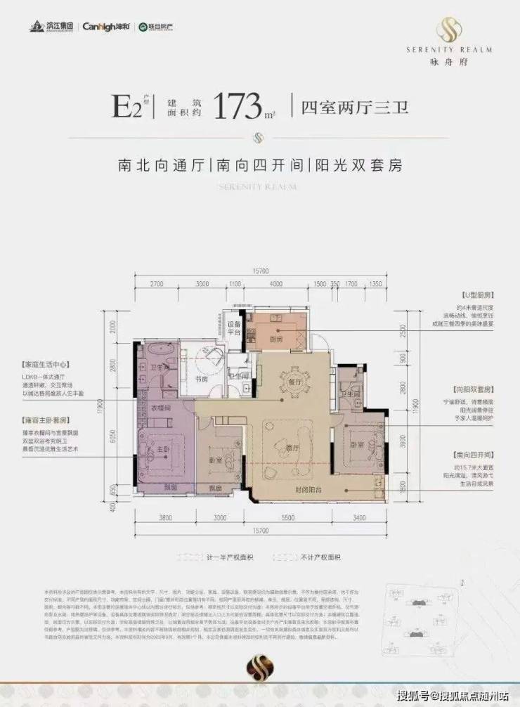四开间朝南,南向面宽超16米。双套房设计,满足二胎家庭、三代同堂等不同居住需求。餐客厅空间阔绰,可放置圆桌,符合中国人团圆的爱家情怀。