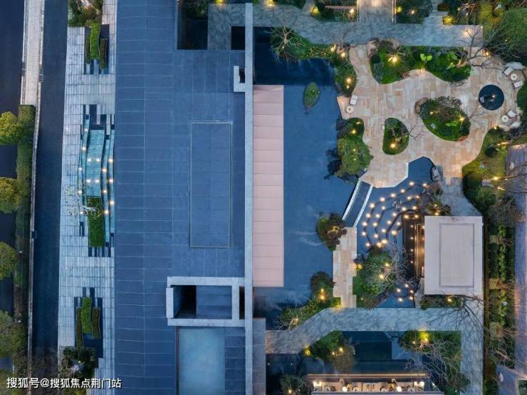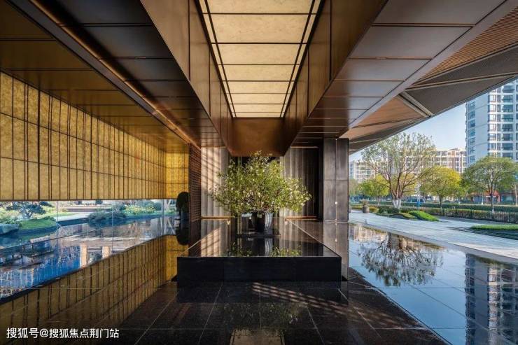 你看,在前场,项目用宝格丽绿奢石打造成一座山丘,再种上铁冬青,叠加潺潺流水,好一幅的微缩山水画卷,不仅寓意富贵满堂,洪福绵延,同时,将江南意境向城市开放。