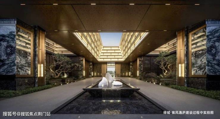 门庭之中,别有洞天。五块汉白玉镇石立于庭前,呼应「五福临门」;顶部「四水归堂」的天井设计,整个入口如同一座「聚宝盆」。