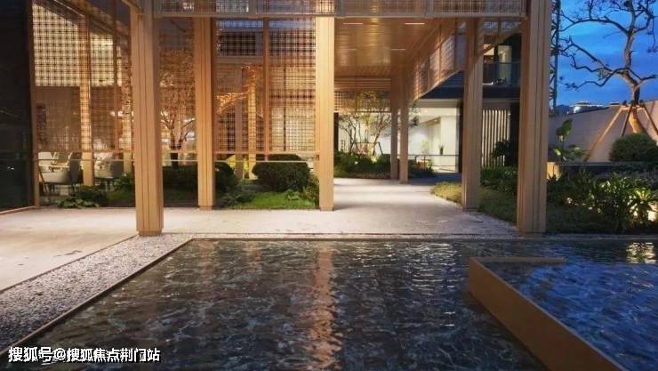 与这片水景连在一起的,是一条精致的游廊,金属格栅和镂空花纹设计,让它有种光影朦胧的美感,水景边上还专门嵌了一个下沉式空间,这就不只是路过的风景,而是可以坐下来好好欣赏的美景。这样让人感到松弛的空间,园区里还有很多。架空层的吧台、茶室和小包厢等多功能休闲空间,