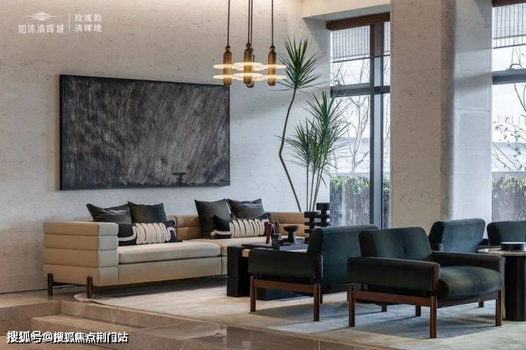 立面采用青灰色,一层石材干挂,铝板勾勒出几何线条,阳台采用玻璃栏杆,实现简约纯净的建筑立面,与低缓的青绿森林融为一体。