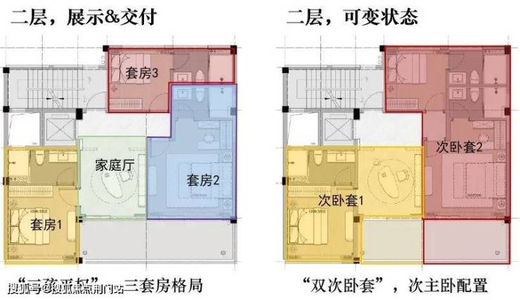 深挖属地客户痛点,以“零浪费+全周期”思维优化户型,以适配家庭结构变化,覆盖从三口之家到长者独居的全周期需求。如杭州晴澜轩采用“去剪力墙+大柱跨”结构,为空间改造预留弹性。同时在365方及422方户型中,二层运用“三孩平权”概念的三套房设计,未来可打通为双次主卧;三层主卧书房预留卫浴点位,幼儿期作独立套房,成年后纳入主卧扩容,实现“一套房适配20年家庭需求”。