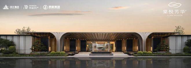 棠悦芳华轩大门实景:萃取东方礼制精髓,沿东西向主轴设置多重归家院落,形成主入口至迎宾水院及度假水池为一体的礼序归家轴。层层递进的空间,在步移景异中,营造出多重归家仪式。