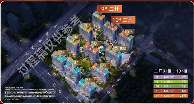 二开加推9#、10#:两幢共计84套,其中108㎡共14套、113㎡共14套、120㎡共14套、128㎡共14套、139㎡共28套。10#楼王正对中央景观水系,南向间距达到惊人的近65m,视野采光无敌;9#南向正对小区花园,西面毗邻规划绿化带,也属于第一次加推108㎡和113㎡,神户型、性价比极高。