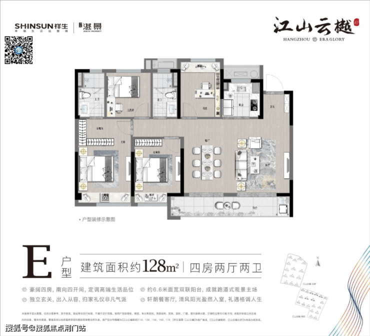 118㎡做到了四房,四开间朝南:主、次两卧再加上餐客两厅,两个南向卧室均带飘窗,餐客两厅横向布局带阳台,北面是客卧和书房,中间夹着干湿分离的次卫。128㎡的户型布局和118㎡基本一致,不过每个房间的面积和尺度更大了。