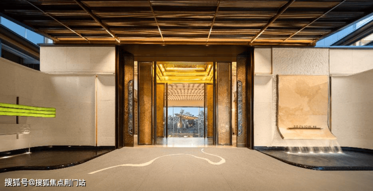 主入口横向延展面达90M,门头采用庑殿形制,以大规格金色金属对称式屋顶,强化归家礼序,立面以透光碧玉奢石呼应“天青”之美,结合星空闪耀的流水景墙,打造“光之水韵”,共同还原古运河形态。