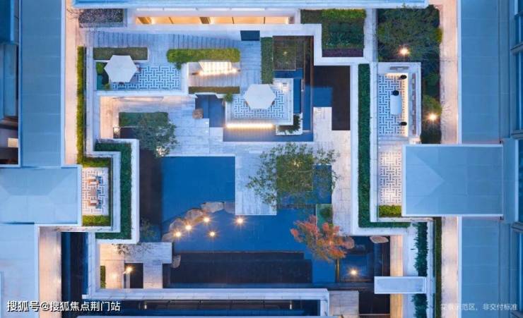 归家动线以环绕下沉式庭院布置。漫步在连廊之上,以水为引再铺陈精选的绿植,随手一拍,松弛气场油然而生。