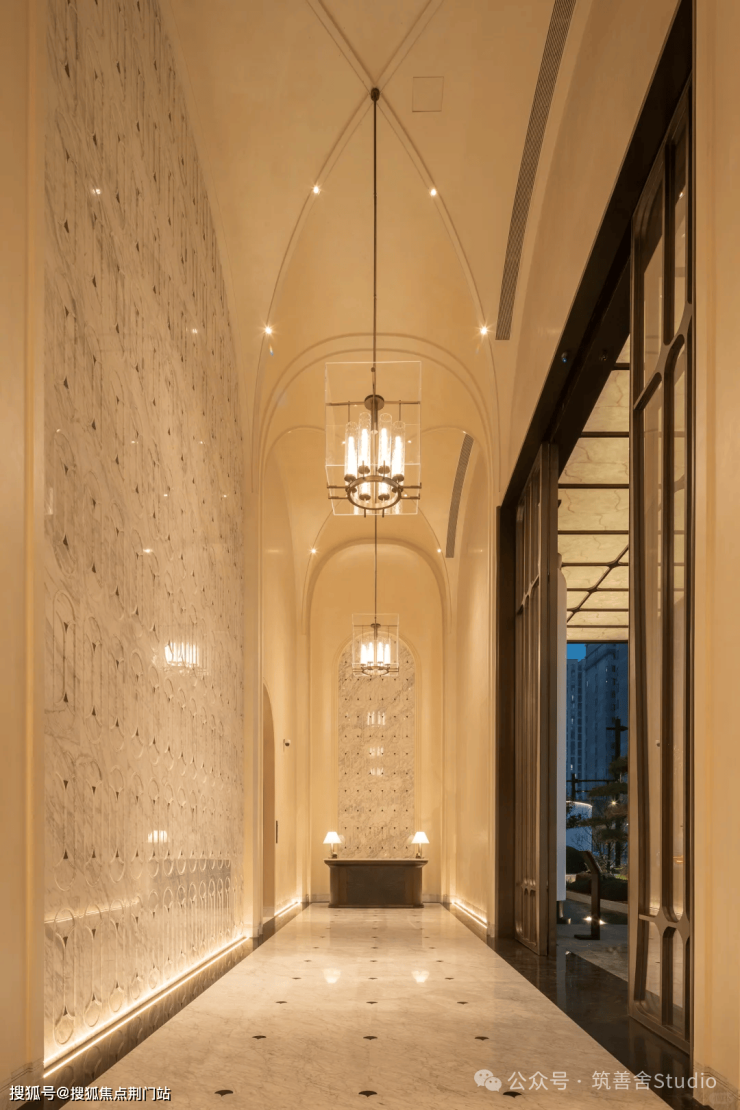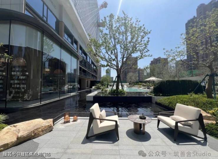 步入此境,眼前即刻展开的是一幅精致的景观水系画卷。流水潺潺,与周围的翠绿植被交相辉映,勾勒出一幅生机勃勃的画面。循水而行,连廊曲折迂回,既为业主提供了避风躲雨的便捷,又营造出一种充满仪式感的回家之路。
