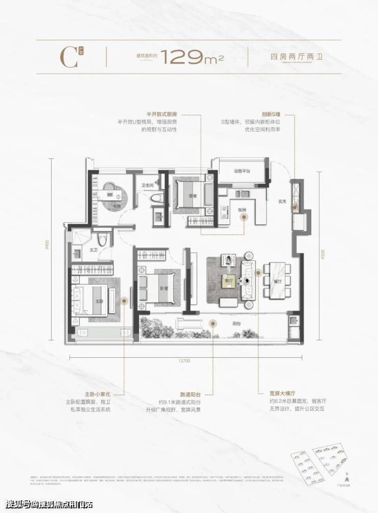 而129更是均衡到位,户户边套格局,全明通透,配合 约12.7m四开间面宽、约9.1m三开间跑道式阳台,时刻感受阳光与风景的照拂, 半开放式厨房,通过L型玻璃移门开合,打开提升情感的交互,关闭则可轻松隔绝油烟。