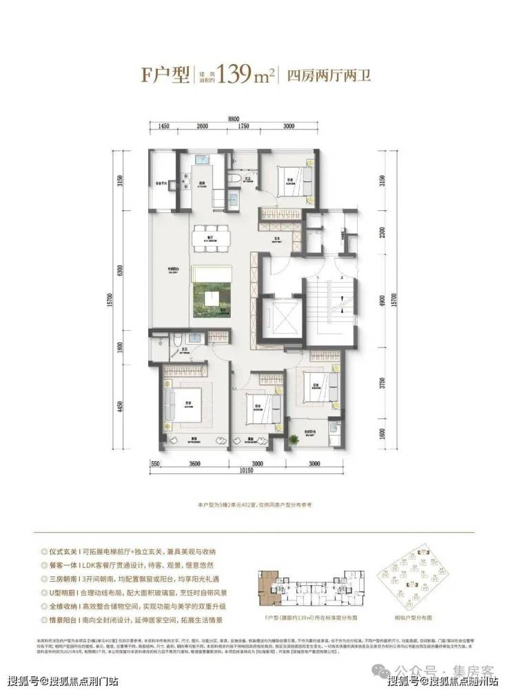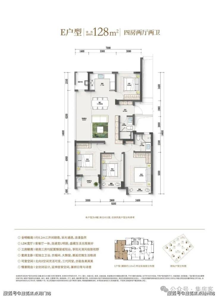 如果预算再多一点,家里人多一点,建面约128㎡边套四房户型,同样也是边厅户型,空间更大,功能性更强,总价相比市面上的139㎡还是亲民了许多。此外,作为板块首个封闭式阳台的住宅项目,还是之江首个全屋五重收纳功能柜子全赠送的项目。