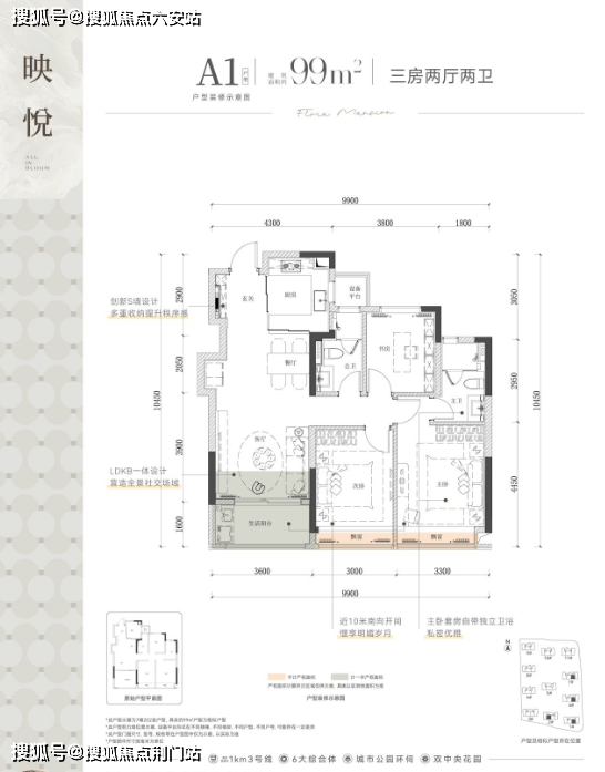 如建面约99㎡的三房两卫户型,动静分区,采用三开间朝南设计,可以放下双开门冰箱哦~配备双飘窗和大阳台,保证了室内通风明亮,同时两个卫生间的设置,解决了早上排队使用的问题。