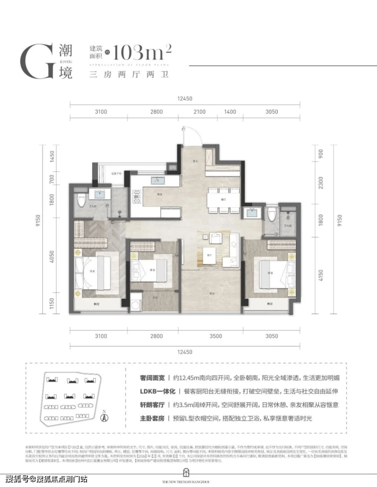建面约103㎡的三房户型,四开间朝南,且南向面宽竟做到了约12.45米,阳光得以在全屋渗透。主卧预留的L型衣帽空间,让女主人一眼动心。