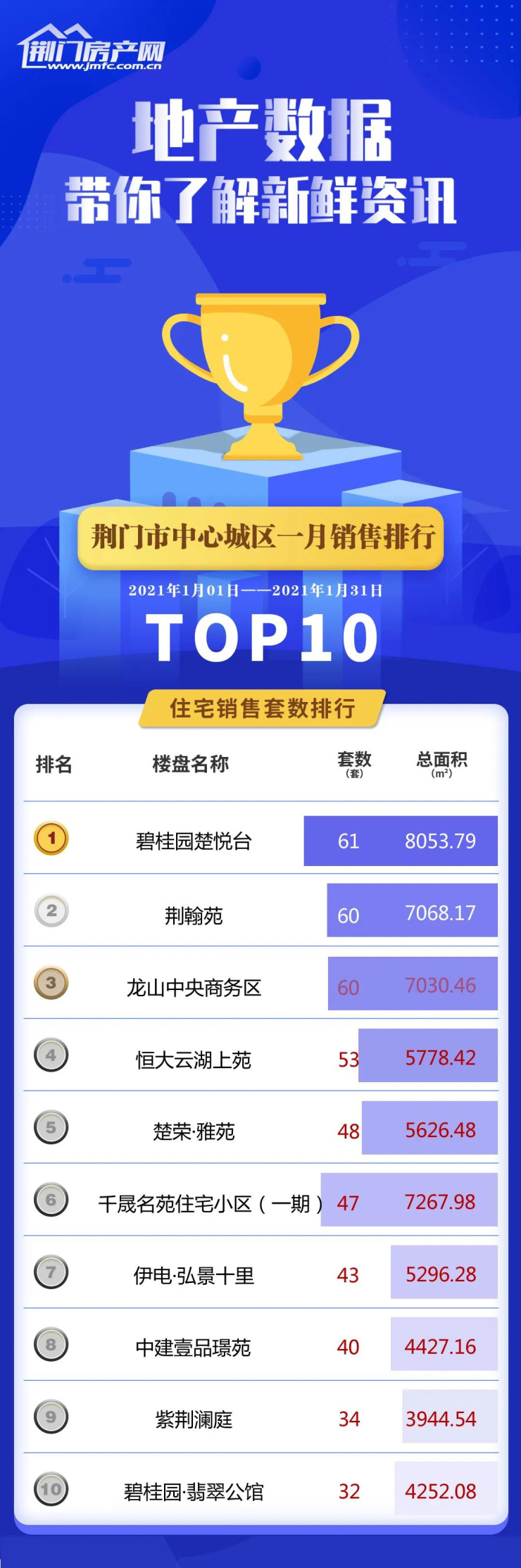 2020年12月荆门市中心城区住宅销量前十共计成交478套,销售面积58745.36平方米。月销售前十中共有2个楼盘位于东宝区,3个楼盘位于掇刀区,5个楼盘位于漳河新区。