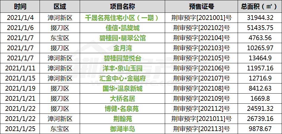 据统计,掇刀区有5个项目取得预售,总共96375.47平方米,合计810套;漳河新区有5个项目取得预售,共96822.44平方米,合计749套;东宝区有2个项目取得预售,总共14642.23平方米,合计114套。
