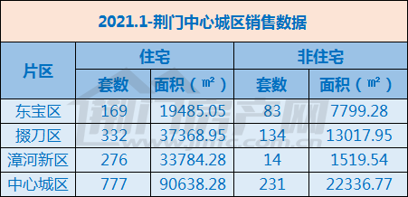 荆门中心城区1月共成交1008套商品房,销售面积112975.05平方米。其中住宅销售777套,销售面积90638.28平方米。非住宅销售231套,销售面积22336.77平方米。