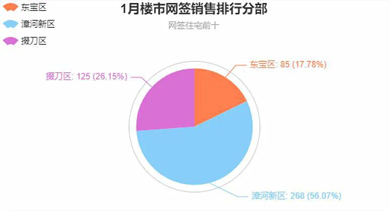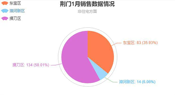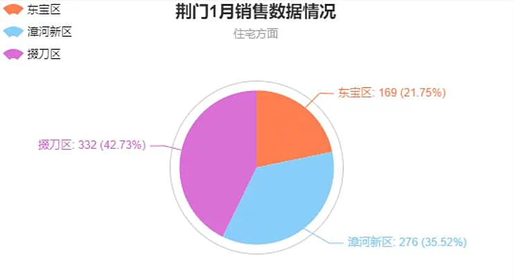 住宅方面,1月中心城区住宅成交套数总计777套,其中住宅成交套数最多的为掇刀区,本月共成交332套,占本月住宅成交总套数的42.73%;其次为漳河新区,共成交276套,占本月住宅成交总套数的35.52%;东宝区共成交169套,占本月住宅成交总套数的21.75%。