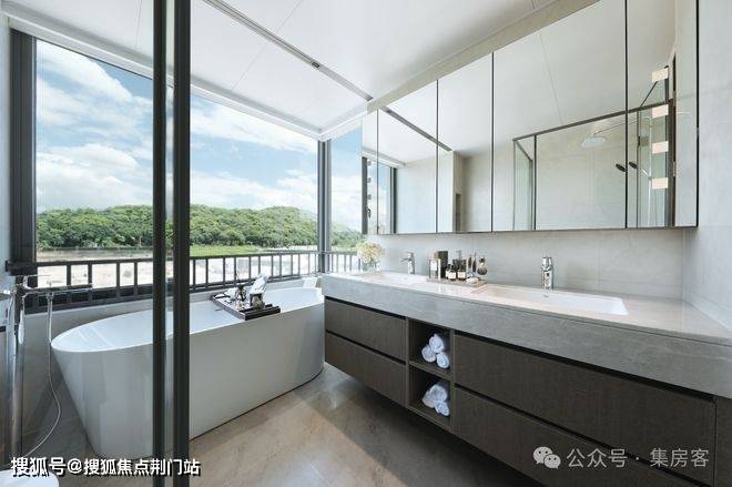 公建化的立面,四面铝板搭配大面积玻璃,阳台统一封包,底层的浅色天然石材还被打磨出弧线,脱去厚重外壳,轻盈洒脱。项目西侧直线约800米就是钱塘江,春来晴翠也在园区里编织了一幅山水画卷。