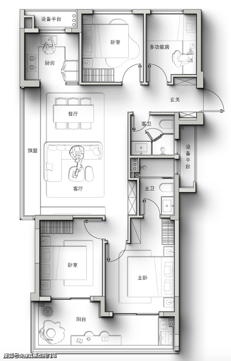 不仅做到了大边厅+四房,而且还带一个进深约2米的转角阳台(很多豪宅阳台进深也不过1.8米),就像自带一座空中花园。