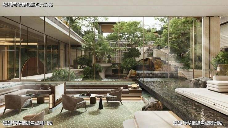 雲润宸庐的约2000㎡中央会客厅,融合书吧、茶室、儿童游乐区等功能,意图构建有温度的“宋韵社群”。整个会所围绕落差超9米的中庭展开,以西湖郭庄为范本,再现了“水、石、松、廊、桥、亭、轩”等经典元素。
