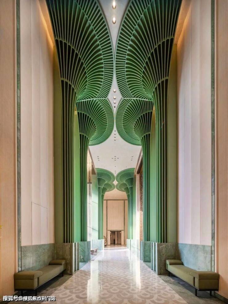 比如约56x11.5米的超尺度门庭,顶部以杭州折扇为造型灵感,寓意“藏风聚气”;四周还有12片巴西进口的百达翡绿奢石雕琢的玉石屏风;中间还有约9.6x5.3米的巨幅铜门,是由非遗传承人朱炳仁手工锻打,再现钱塘潮涌的磅礴气场。