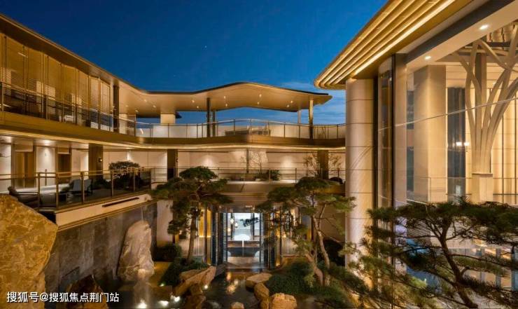 景观以「四境四巷」铺陈东方礼序,「五重归家」轴线串联宽约128米恢弘门庭、约15米叠石飞瀑、约13米榫卯转译的现代穹顶等。约1300㎡下沉式庭院采用三层立体观景设计,15米叠石飞瀑再现《溪山行旅图》的山水意境。