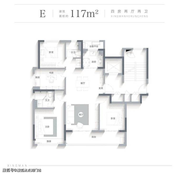 约117㎡户型点评:全明方正通透, 提升空间利用率,LDKB一体,营造大尺度餐客双厅, 亲朋从容相聚,双开间观景阳台, 晾晒之余, 亦可成为兴趣天地,四房功能, 让家庭成长的理想一步到位