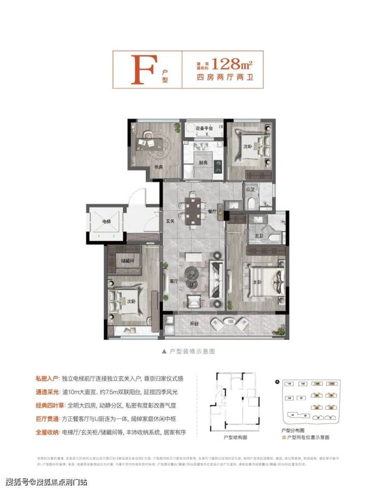 约135㎡户型点评:独立门厅:独立电梯前厅连接独立玄关入户尽显归家礼仪风尚,经典四叶草:奢阔大四房,分散式布局,私密有度彰大宅气度,尊崇双套房:南向卧皆配独立卫浴,同面积段产品,板块祗此,迭代三卫:创领超配设计,隐私主卫,体面客卫,定义富春新改善,环幕通透:三面采光,方正格局,约7.5m巨幕阳台盛载阳光