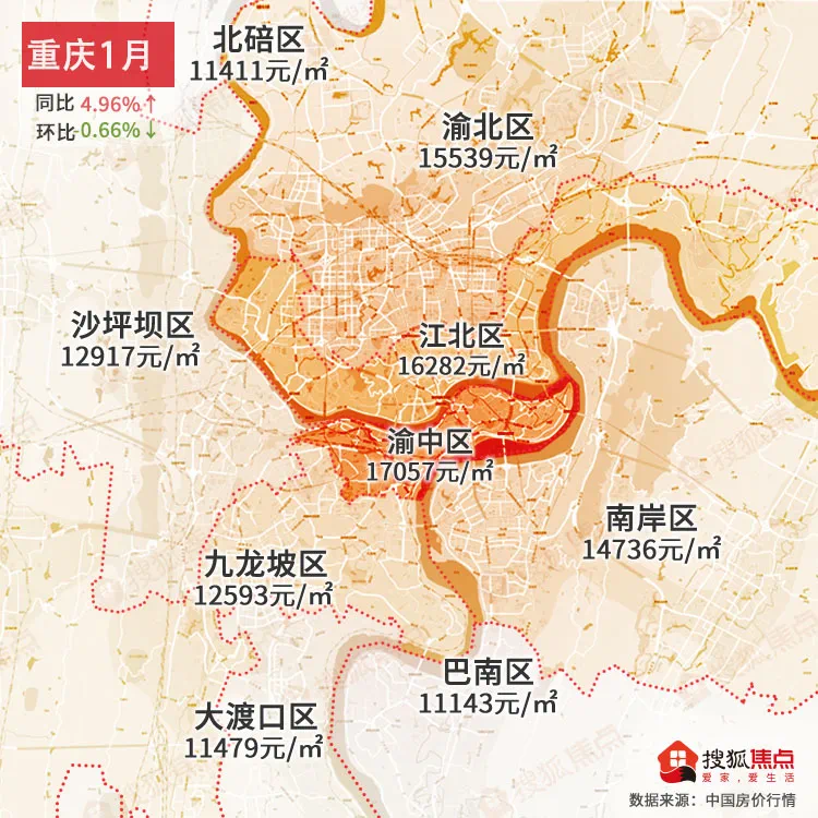 重庆1月均价为12679元/㎡同比上涨4.96%↑,环比下跌-0.66%↓